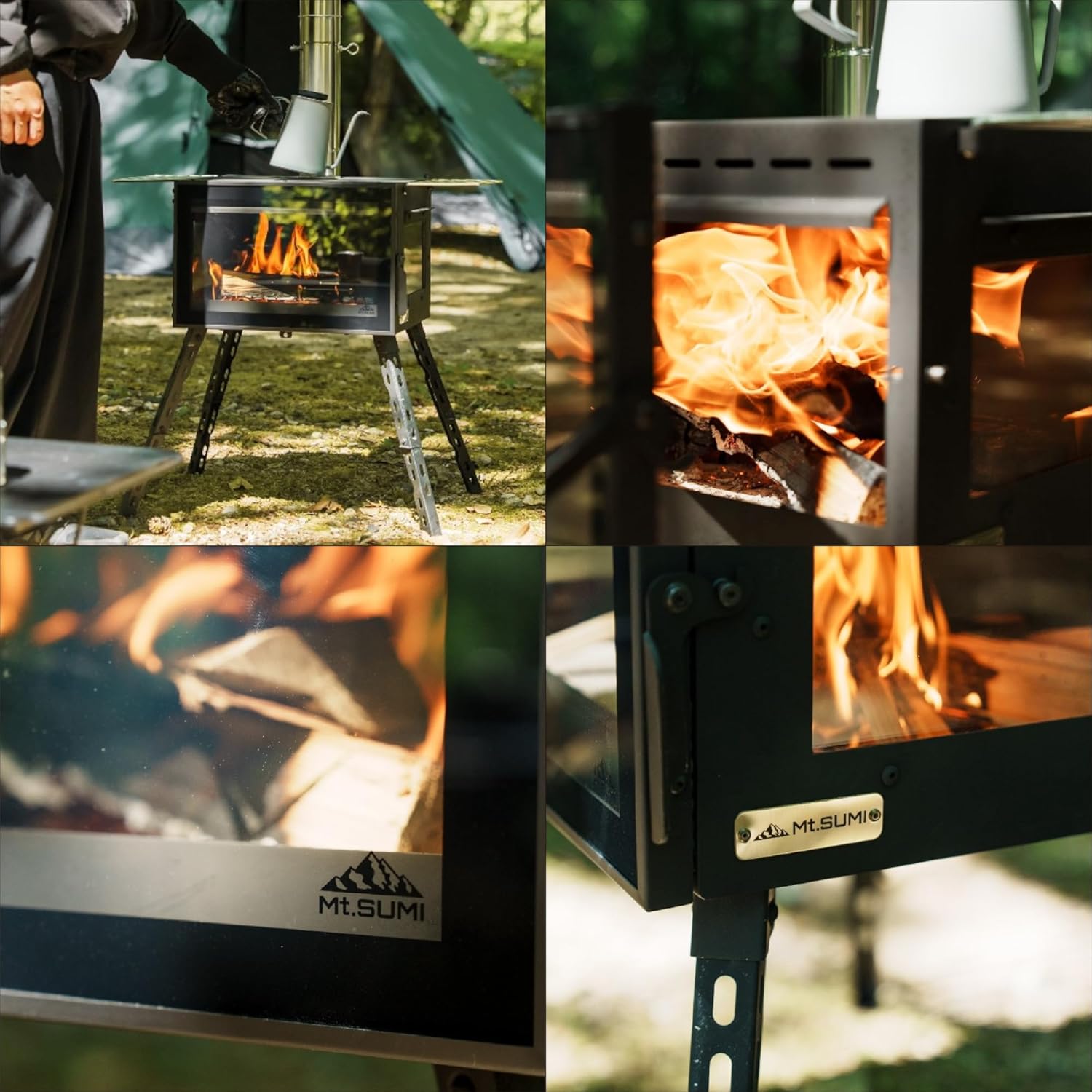 3面の耐熱ガラス窓から、パノラマで炎の揺らぎを楽しめるステンレス製薪ストーブ。錆びにくくメンテナンスしやすいステンレス素材を採用しながら、高いコストパフォーマンスを実現しています。煙突や掃除用ブラシまでセットになったオールインワン仕様で、初心者でも安心して導入できます。コンパクトに収納でき、ソロからデュオ、ファミリーまで幅広く対応します。
